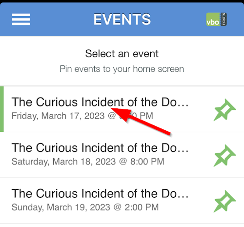 Tap on the show you want to check patrons in for. Notice the green rectangle that appears to the left of the selected show