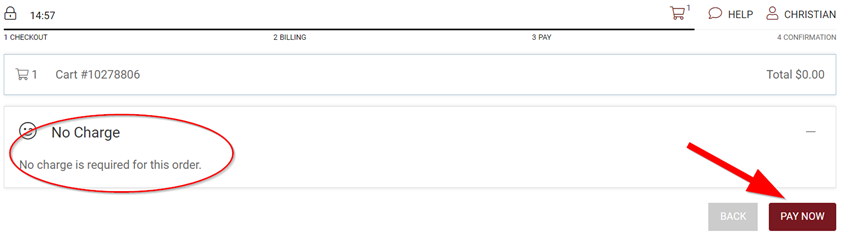 11. If all tickets in your cart have applied flex tickets, you will see a screen that shows “No Charge is required for this order” Otherwise, you will be asked for credit card information. Select the “Pay Now” button.