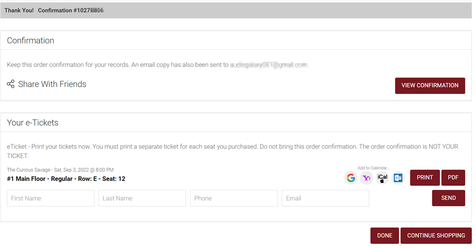 12. You will be taken to your confirmation page. Here you can indicate the names of guests attending the show on each ticket, print tickets, or send them via email. You will also receive an email confirmation for your order. If you do not get to this page, your order is not complete, and your seats may not be reserved for you.