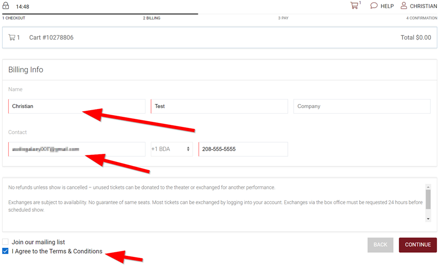 9. Notice the applied flex tickets drop the cost of tickets in your cart to no cost. Select the “Continue” button.