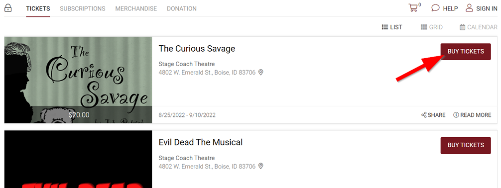- Select “Buy Tickets” button next to the show you’d like to see