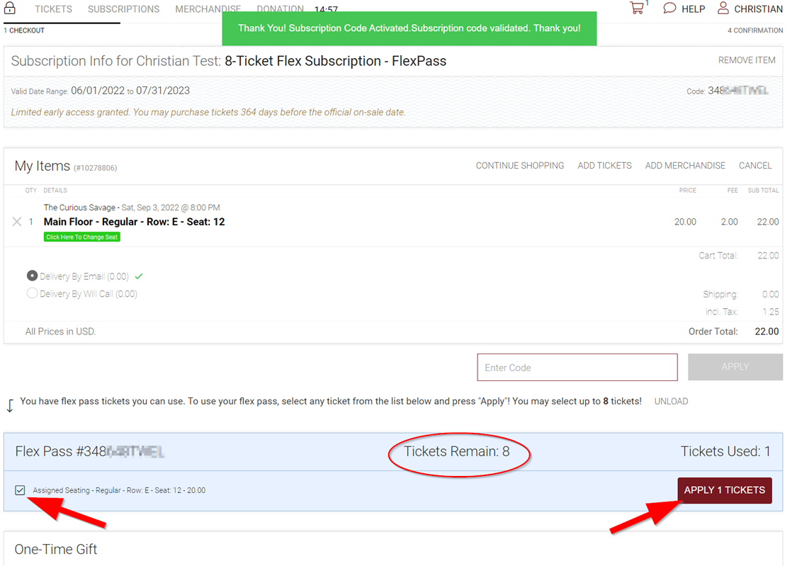 8. Once you have logged in (or entered your subscription code), your Subscription will automatically load. Check the box next to each ticket in which you would like to redeem flex tickets, then select “Apply # Tickets”.
