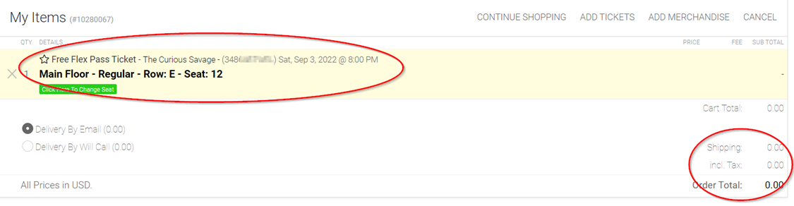 9. Notice the applied flex tickets drop the cost of tickets in your cart to no cost. Select the “Continue” button.