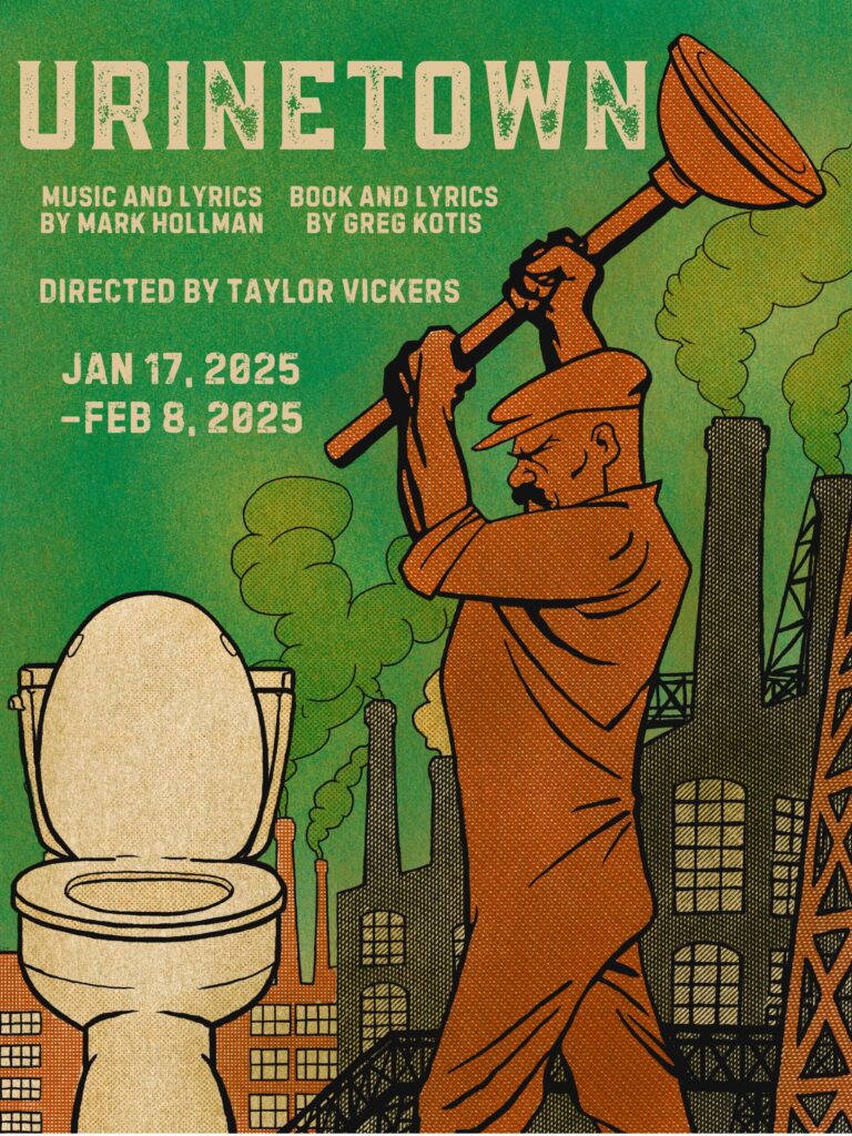 Winner of three Tony Awards, three Outer Critics Circle Awards, two Lucille Lortel Awards and two Obie Awards, Urinetown is a hilarious musical satire of the legal system, capitalism, social irresponsibility, populism, environmental collapse, privatization of natural resources, bureaucracy, municipal politics, and musical theatre itself! In a Gotham-like city, a terrible water shortage, caused by a 20-year drought, has led to a government-enforced ban on private toilets. The citizens must use public amenities, regulated by a single malevolent company that profits by charging admission for one of humanity’s most basic needs. Amid the people, a hero decides that he’s had enough and plans a revolution to lead them all to freedom! Inspired by the works of Bertolt Brecht and Kurt Weill, Urinetown is an irreverently humorous satire in which no one is safe from scrutiny.